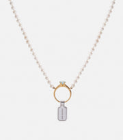 Materials: 18 K gold plated silver, 3 microns + protector. Natural gemstone: sky blue topaz 5 mm and natural pearls. Measurements: All-around length: 45 cm. Natural Pearls: 0,35- 0,4 cm. Ring with label 1,8 cm x 4 cm. All our jewelry items are handcrafted in Spain, recovering traditional techniques that meet fine jewelry standards.